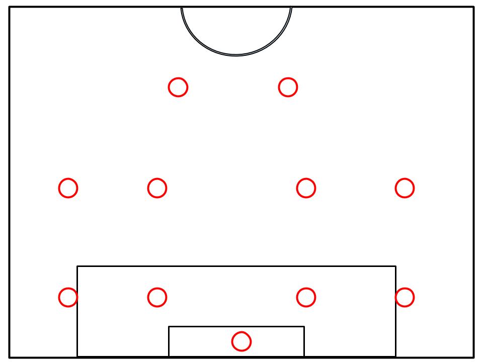 For playing for the tie there are three options for the goalkeeper: Let the team play how they have been, go more defensive, or go more attacking. Letting the team play how they have been has a good chance of working as it is how the rest of the game has gone. In this case, the goalkeeper does not need to communicate much different to their team except encouragement for keeping the same intensity of play up. As shown in the picture below, this is how the team would have been playing for the entire game and will continue to play for the rest of the game if that is the option that is chose. The only issues to continuing to play this way is that the opposing team could start attacking hard so this tactic would not end up being viable. Another issue is that there is no goal in mind. The team would not be sure if they are trying to play for the tie or to try to win.