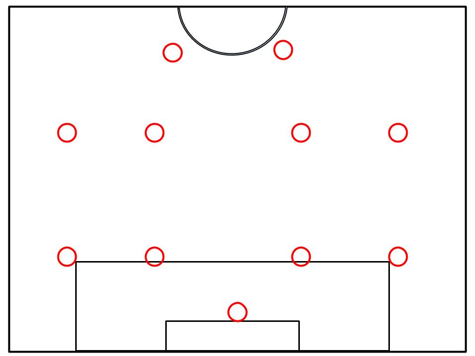 The second option would to be to go more defensive. This would be used to play for the tie. As shown in the picture below, the team would drop back some. The team would not need to drop back completely as they still need to be able to attack. The goalkeeper becomes involved as they need to communicate to their team to start dropping off more. The issue with this is that if the other team scores, it may be hard to turn the mentality of the team from defending to attacking.